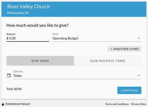 River Valley accepts online gifts securely through Realm, our online database and church management software. Give a single gift, or schedule recurring giving using your checking account, debit, or credit card.