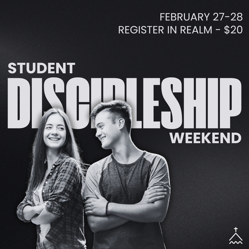 This weekend is all about making disciples. This will be an impactful weekend for our students - filled with gospel teaching, breakout sessions, community group time, and building relationships. Our goal, as always, is that our students learn the truths of the gospel and apply those truths as they learn to live for Christ. We also want to create an environment of fun and relational growth that builds friendships that last a lifetime. Students are encouraged to bring their friends and join us for this important weekend of discipleship, February 27 (6pm)-28 (8pm).